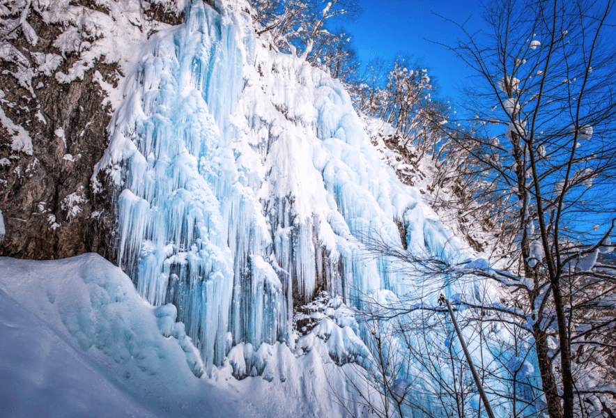 沢を流れる水さえも、芯まで凍りつき、動きを止める頃です。山あいの小さな流れは音を失い、静まり返った景色が冬の深まりをはっきりと伝えてきます。